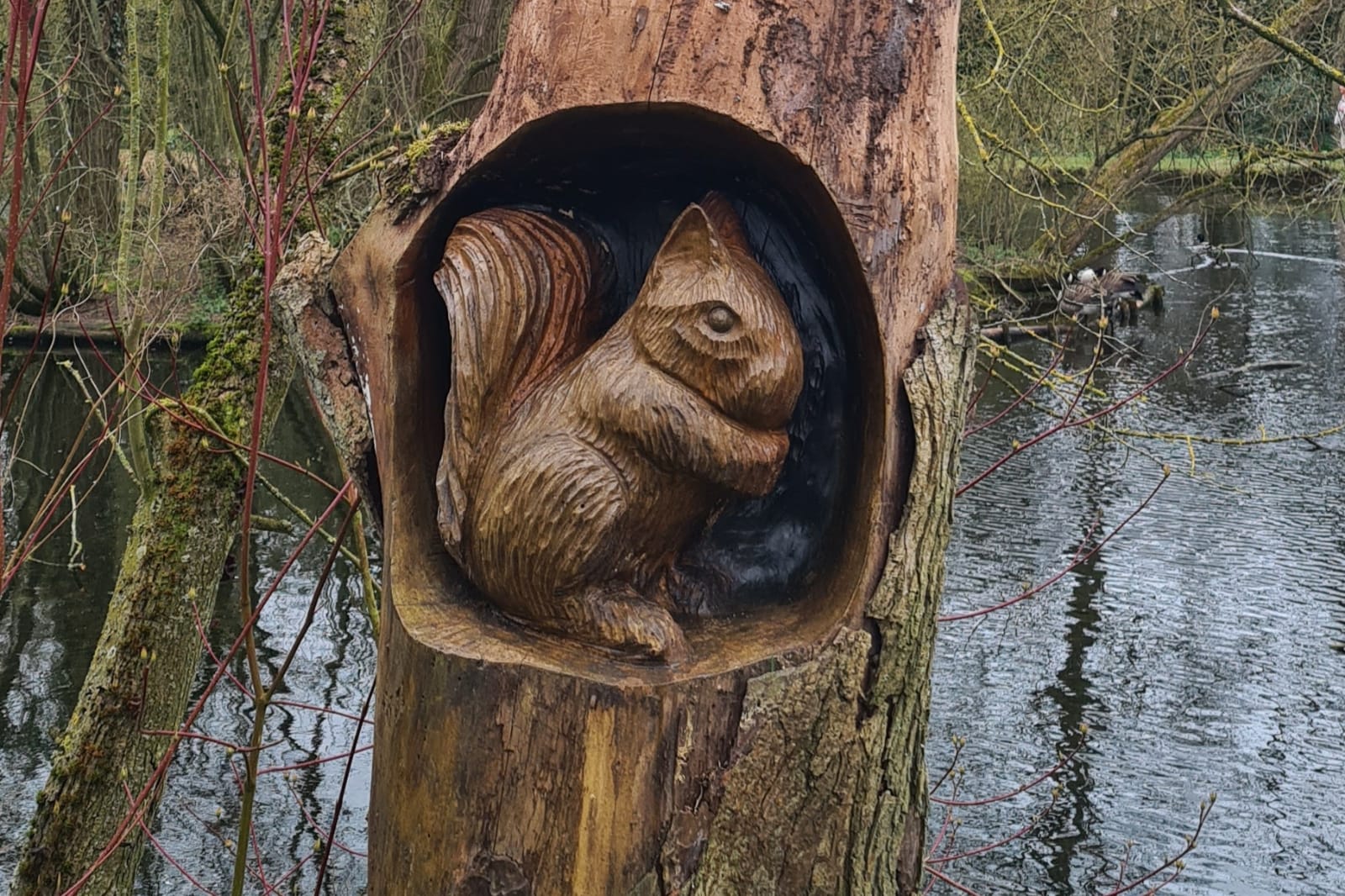 Whilst you walk you can spot wooden carvings in trees and hiding amongst the groves. Can you spot the kingfisher hiding in the bushes? Look a little higher for the owl and the squirrel.